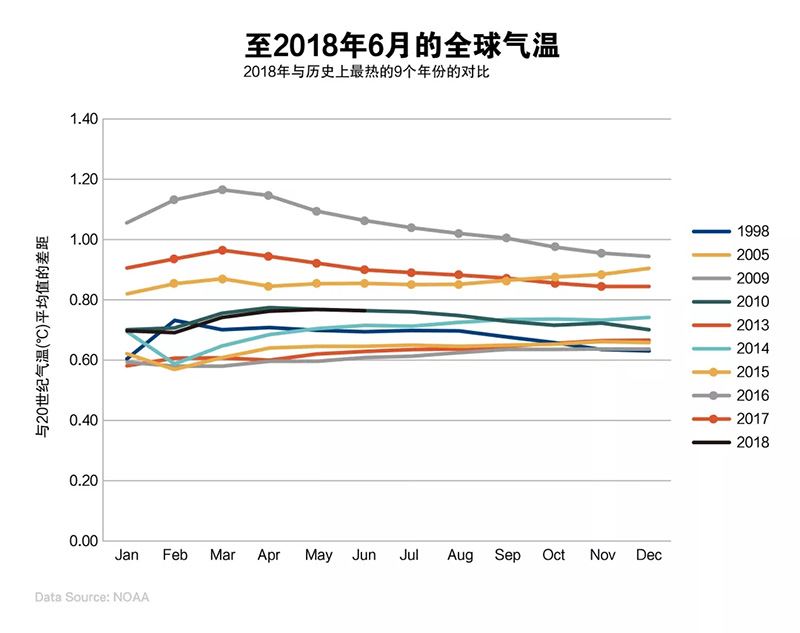 美國國家海洋和大氣管理局(NOAA)的數據顯示,2018年上半年地球陸地和海洋表面的溫度高于平均水平。
