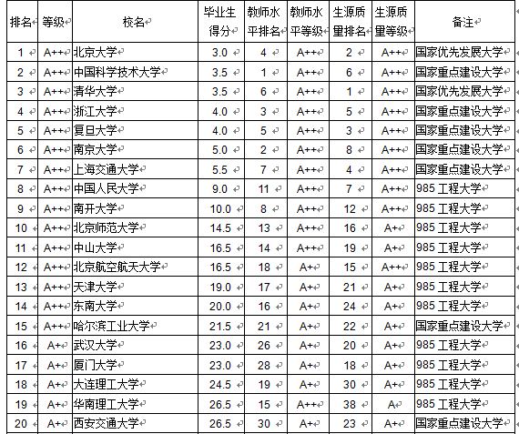 本科畢業(yè)生質(zhì)量排名的計(jì)算過程:將每所大學(xué)的教師平均學(xué)術(shù)水平在全國大學(xué)中的名次,與新生錄取分?jǐn)?shù)線在全國大學(xué)中的名次相加并除以2,得到畢業(yè)生得分(越小越好),將所有大學(xué)的畢業(yè)生得分按升序排列,即得到全國大學(xué)本科畢業(yè)生質(zhì)量排行榜。畢業(yè)生得分相同的,按教師學(xué)術(shù)水平高的排在前面。